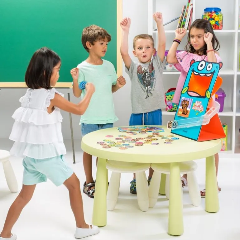 Descubre el abecedario y aprende a construir palabras de forma rápida y muy lúdica: los discos que debes lanzar a la boca del monstruo, son letras para lograr crear las palabras que se indican en los dibujos de las tarjetas. Lánzalas en el orden correcto, ¡y mejora tu velocidad para deletrear!