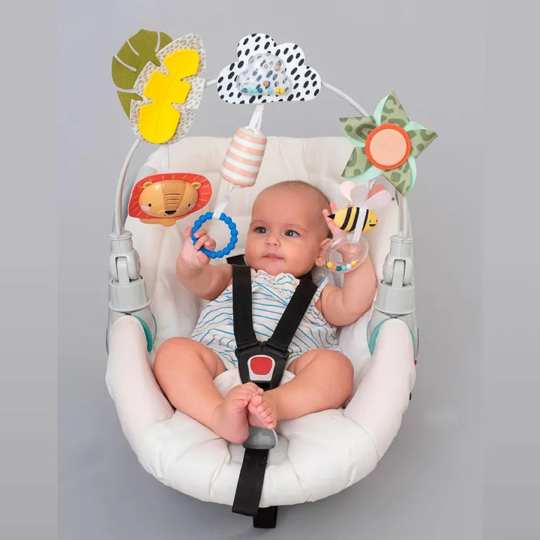 Sorprende a tu bebé con este conjunto de actividades que estimularán sus sentidos. Sonajeros, contrastes de color, distintas texturas, anillo de dentición… Todo tipo de elementos que podrá explorar con manos y boca desarrollando así su coordinación ojo-mano, ¡mientras disfruta de un agradable paseo!