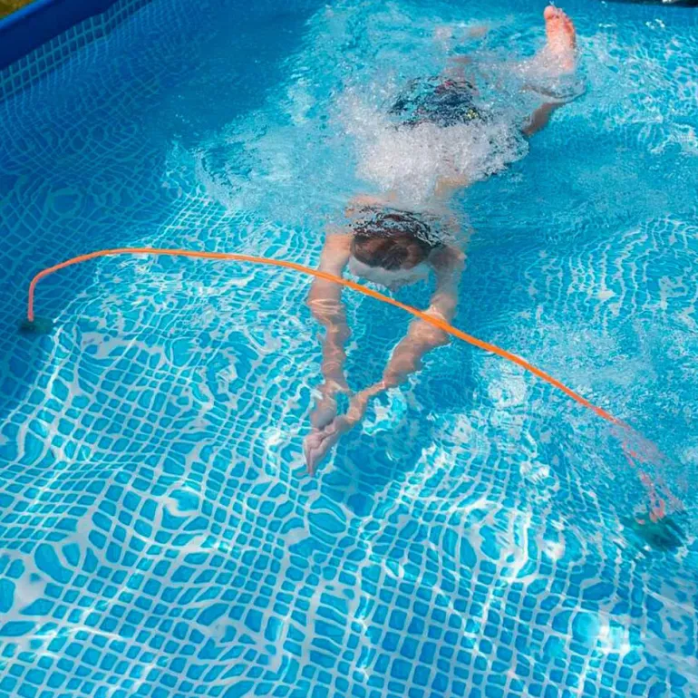 Pon a prueba tus capacidades y desafía a amigos y familia, jugando a bucear con este genial arco. Consiste en una gruesa cuerda resistente al agua y dos pesos en sus extremos, que mantendrán el arco en la posición que hayas elegido, ¡inventa un sinfín de juegos y circuitos con este fantástico juego acuático!