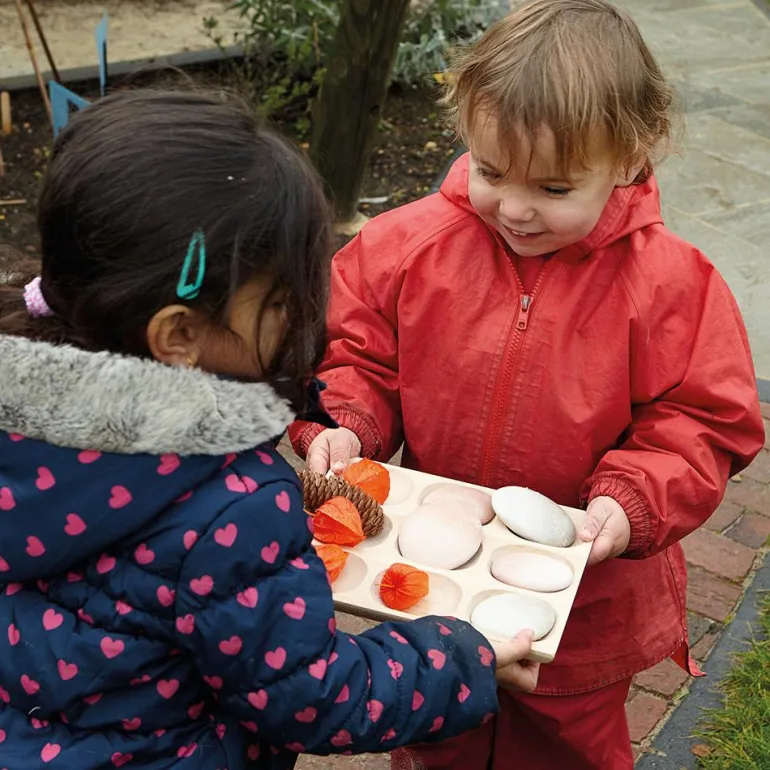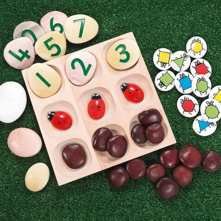 Bandeja de madera formada por seis pétalos exteriores y una zona central, ideal para la primera aproximación a la clasificación, recolección y el recuento.