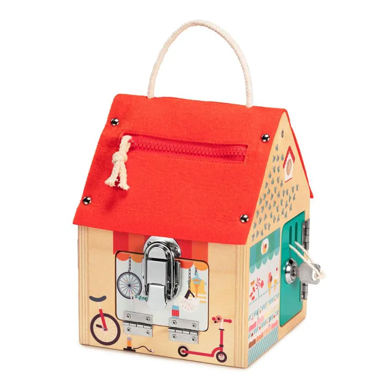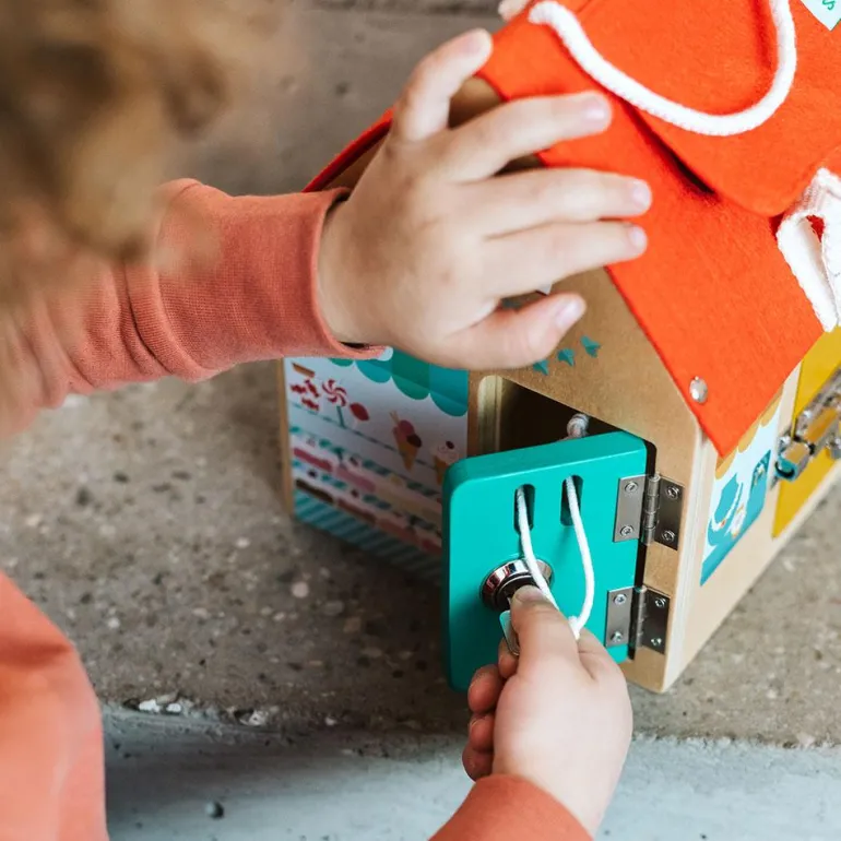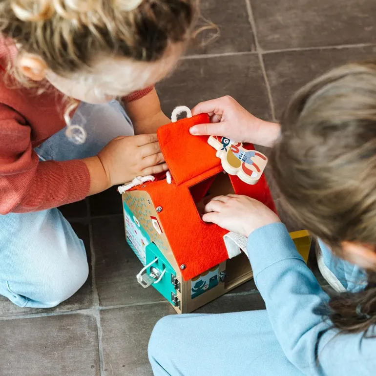 Los más pequeños de la casa podrán descubrir y practicar con diferentes tipos de cierre con esta genial casa de tela y madera, mientras desarrollan su motricidad fina y su imaginación mientras inventan mil aventuras.