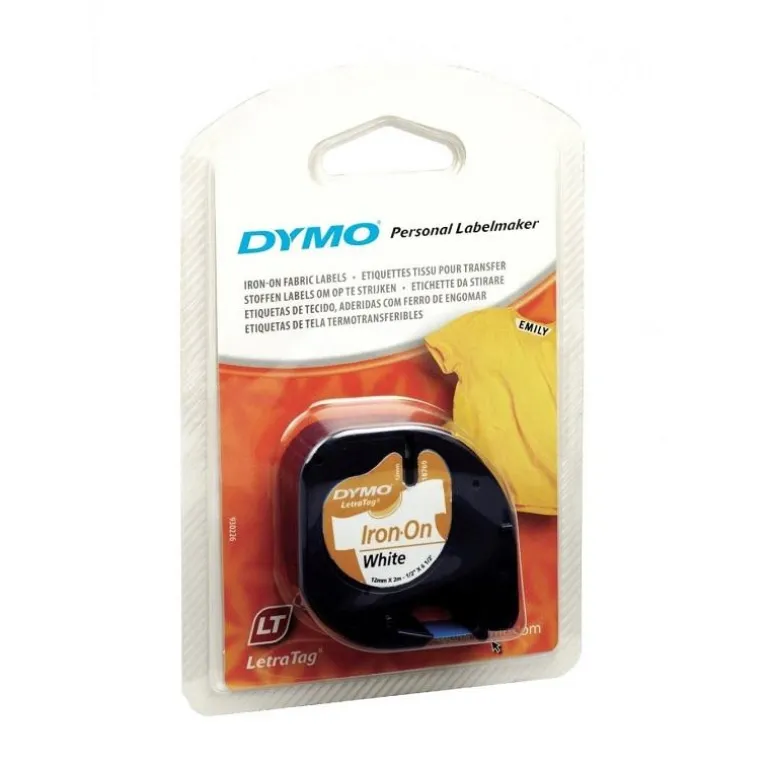 Rollo de cinta de tela para Dymo Letratag, especial para ropa. Se pega mediante el planchado. 12 milímetros x 2 metros, negro sobre blanco.