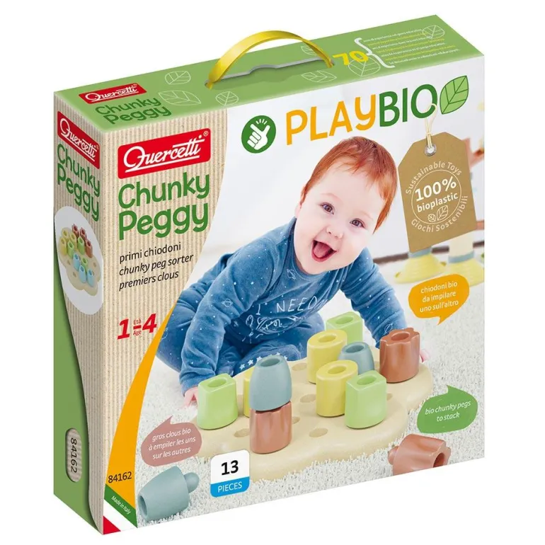 Los juegos de la línea Play Bio han sido fabricados con bio plástico, un material compuesto exclusivamente de madera y plástico, diseñado para reducir las emisiones de CO2 en el planeta; de esta manera, Quercetti combina la innovación de los materiales con el valor educativo del juguete