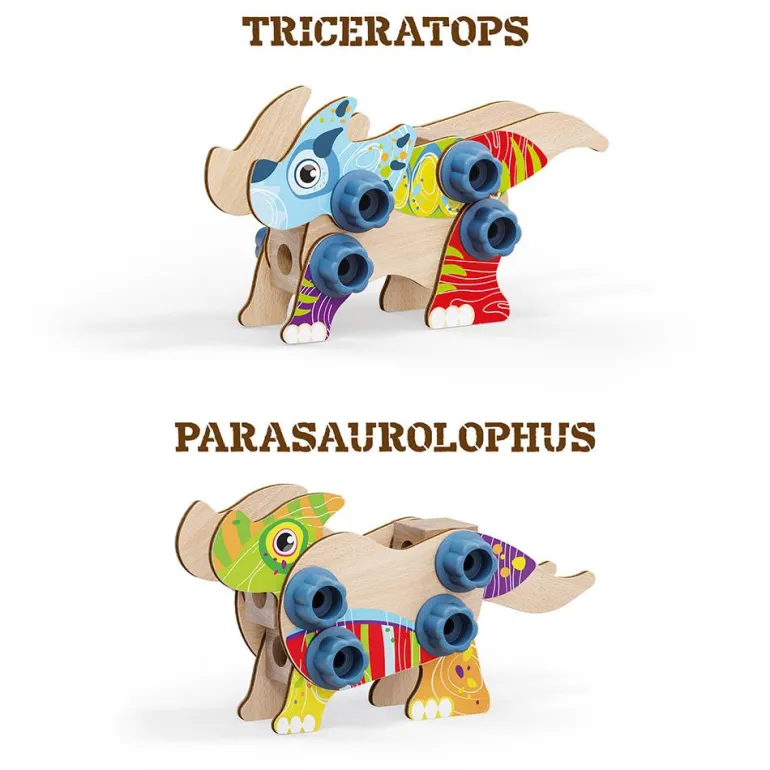 Los juegos de construcción estimulan el pensamiento lógico y la resolución de problemas, siendo muy efectivos en el desarrollo de la atención y la concentración. Combinando las distintas piezas para construir el dinosaurio elegido, niños y niñas desarrollarán también su motricidad fina al enroscar y desenroscar las tuercas. Los juegos de la línea Play Bio han sido fabricados con madera y bio plástico, un material compuesto exclusivamente de madera y plástico, diseñado para reducir las emisiones de CO2 en el planeta; de esta manera, Quercetti combina la innovación de los materiales con el valor educativo del juguete.
