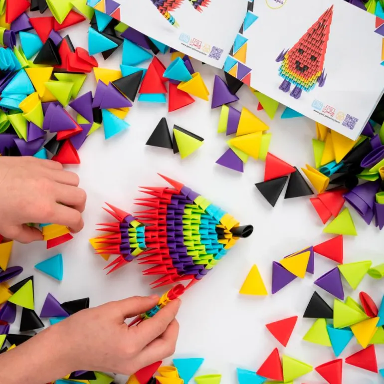 Las piezas son de colores vivos, suaves y flexibles. Su forma inspirada en el origami despertará la imaginación de mayores y pequeños, pues invita a explorar las posibilidades de construcción y experimentar con el equilibrio, la simetría y la verticalidad. Favorecen el desarrollo de habilidades motoras finas, la creatividad y la coordinación ojo-mano de una forma muy divertida.