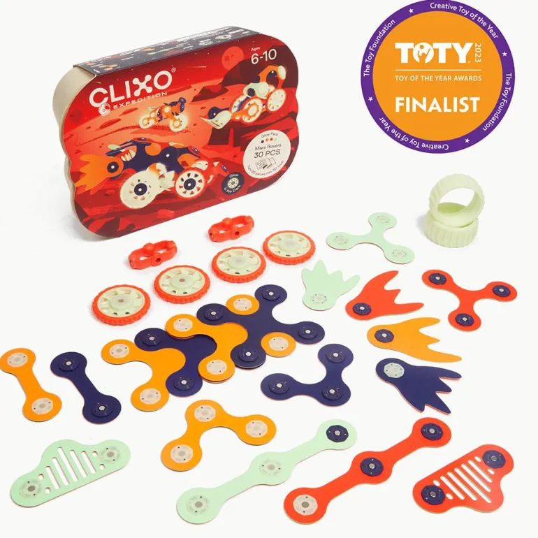 Descubre Clixo, un innovador juego de construcción magnética con piezas flexibles con el que crearás alucinantes figuras, ¡deja volar tu creatividad con este set inspirado en la exploración en Marte que brilla en la oscuridad!