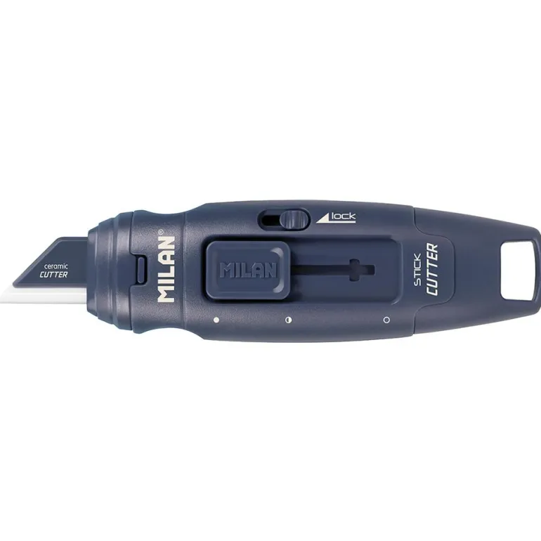Cúter con hoja de cerámica, diseño serie 1918 Milan en color azul marino, tamaño pequeño tipo bolsillo, botón deslizador con dos posiciones y cuchilla con protector y sistema de bloqueo de seguridad.