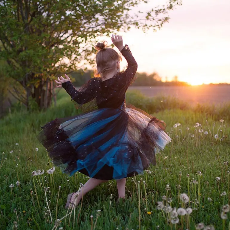 Con este alucinante vestido azul con detalles de tul negro y lentejuelas, podrás sumergirte en el intrigante mundo de la magia y los hechizos convirtiéndote en la bruja más enigmática, ¡el fantástico sombrero que incluye te aportará un aire tenebroso de lo más inspirador!