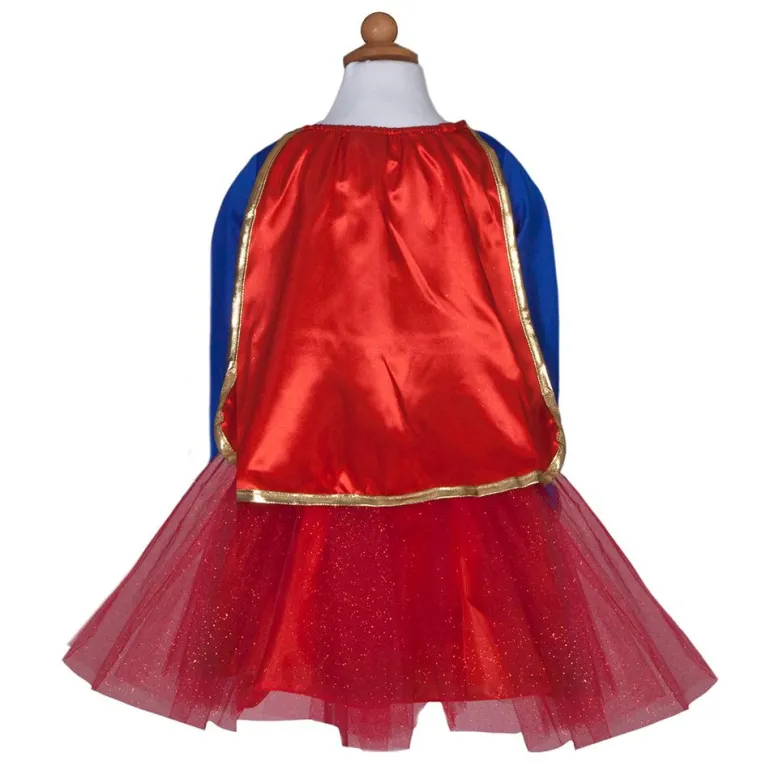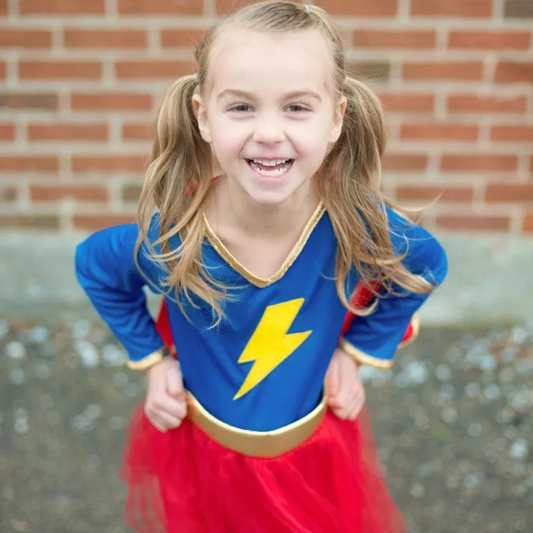 Este disfraz emula a la perfección el atuendo de las superheroínas más inspiradoras. Los disfraces son una gran herramienta para ejercitar la imaginación y las habilidades sociales de los niños y niñas, que les permiten interpretar diferentes roles, de modo que se animarán a idear sus propias historias e interpretarlas, lo que mejora su vocabulario y sus dotes creativas.