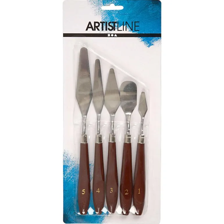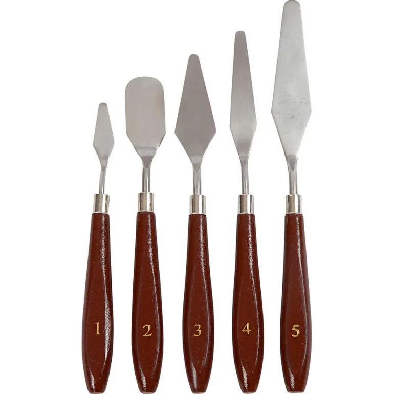 El kit de espátulas incluye cinco herramientas -espátulas y paletas-, fabricadas en acero y con mango de madera barnizado. ¡Abastécete con los mejores materiales, y pon a prueba tus dotes artísticas!