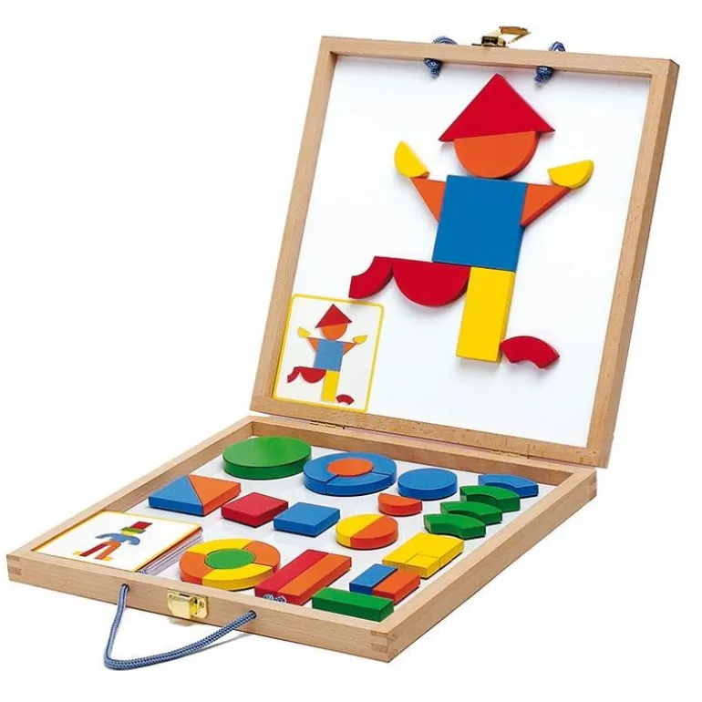 ¡Diviértete creando un sinfín de figuras y composiciones! Da rienda suelta a tu creatividad con este maletín repleto de piezas magnéticas de madera, que podrás combinar una y otra vez.