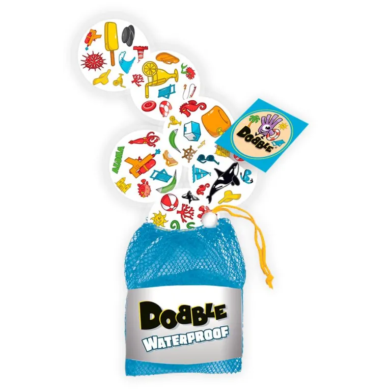 Prepárate, observa… ¡y sé el más rápido en encontrar el objeto que coincide entre las cartas y nombrarlo en voz alta! Esta versión del clásico Dobble, perfecta para viajar, contiene cartas impermeables.