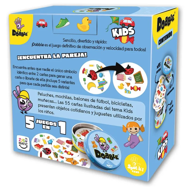 Prepárate, observa… ¡y sé el más rápido en encontrar el objeto que coincide entre las cartas y nombrarlo en voz alta! Descubre la edición especial del clásico Dobble pensada para los más pequeños y pequeñas de la casa.