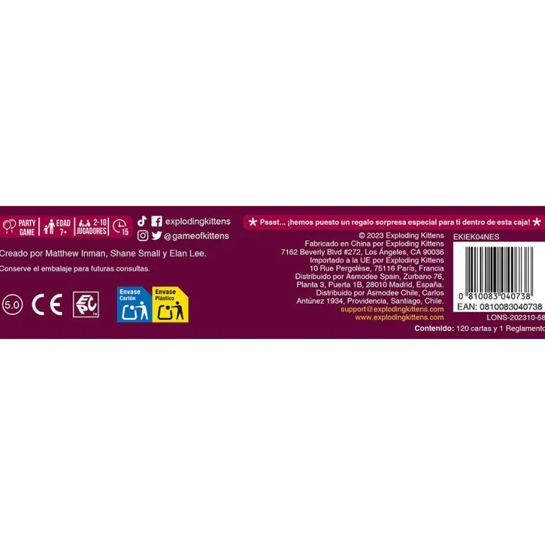 En Exploding Kittens, el azar y la estrategia se entremezclan de una forma magistral. Sus reglas son sencillas y las partidas cortas y emocionantes, lo que le aporta un componente adictivo difícil de superar. ¡Muy pronto, será vuestro favorito indiscutible! Es el proyecto de kickstarter con más patrocinadores de la historia, ¡descubre por qué! Fabricante/Representante: Asmodee Group 18 Rue Jacqueline Auriol, 78280-Guyancourt France Email: [email protected]