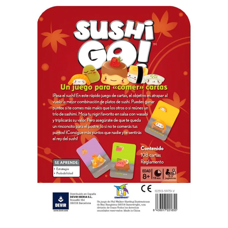 Sushi Go! se convertirá en el juego de cartas favorito de los niños y niñas… ¡y también de los mayores! Sus rondas rápidas y trepidantes resultan adictivas, y las cartas, con sus coloridas y alegres ilustraciones, animan la partida. El estuche de cartas tiene el tamaño ideal para poder llevarlas de viaje o de excursión. Las tardes en familia y con amigos ¡nunca han sido tan divertidas!