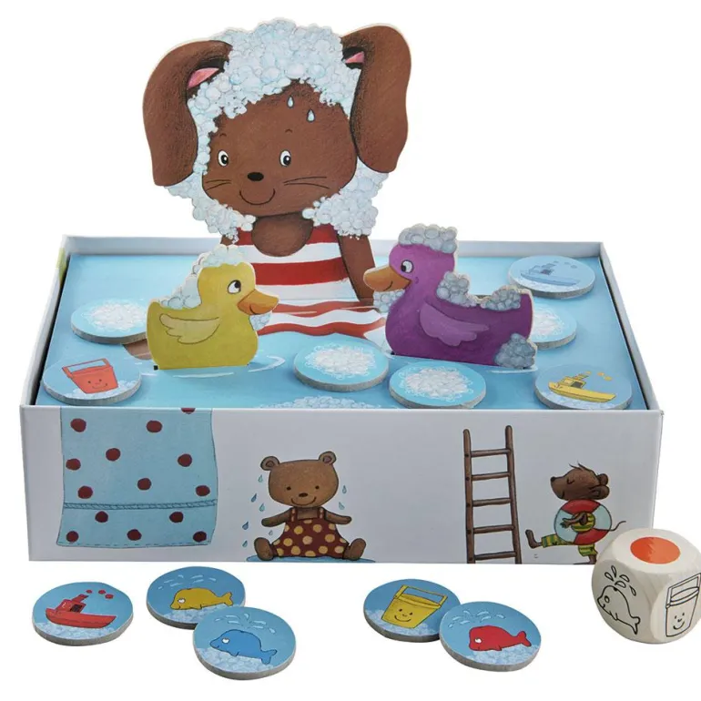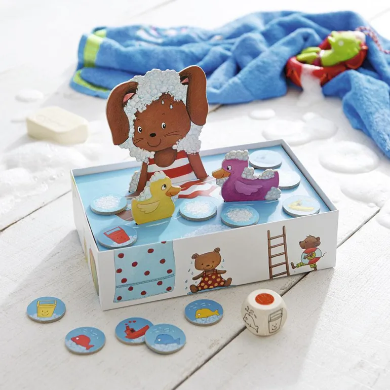 El conejito Burbuja está en la bañera jugando con sus juguetes y de repente ¡Plas!, desaparecen sus dos patitos, su cubo y su barco ¿Dónde se habrán metido? Hay tanta espuma en el agua que es difícil recuperarlos. ¡Menos mal que cuenta con tu ayuda para encontrarlos todos de nuevo! Tras preparar su pequeña bañera, será el momento de poder echarle una mano. Clasifica los distintos colores y formas para seguir la secuencia y encontrar sus juguetes de vuelta.