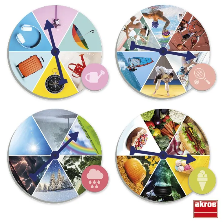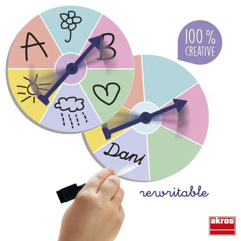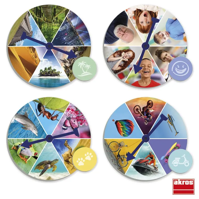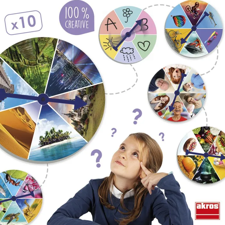 El juego es muy sencillo, solo debes girar las ruletas y observar las imágenes reales que indican, ¿podrás inventar una historia con sentido que incluya esas imágenes? Si la creatividad es lo tuyo, este juego te fascinará. Las ruletas son temáticas y se incluyen 2 reescribibles para que dibujes o escribas lo que quieras y añadir nuevas opciones al juego.