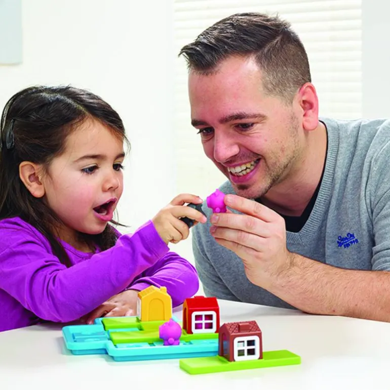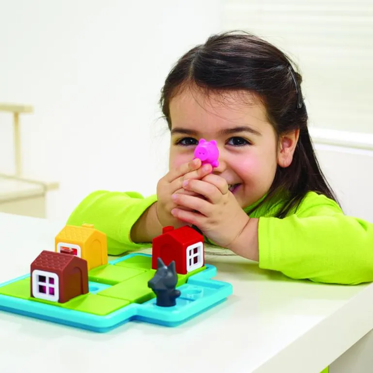 Los Tres Cerditos es un juego de ingenio perfecto para iniciarse en los juegos de lógica, ya que dispone de pocas piezas grandes y fáciles de manipular. Los niños y niñas quedarán fascinados con las figuras de los cerditos y el lobo, al ver cómo los cerditos entran en las casas y se asoman a las ventanas. Los retos disponen de distintos niveles de dificultad que aumentan progresivamente, facilitando el desarrollo del pensamiento lógico a la vez que los más pequeños afianzan sus habilidades manuales y de resolución de problemas.