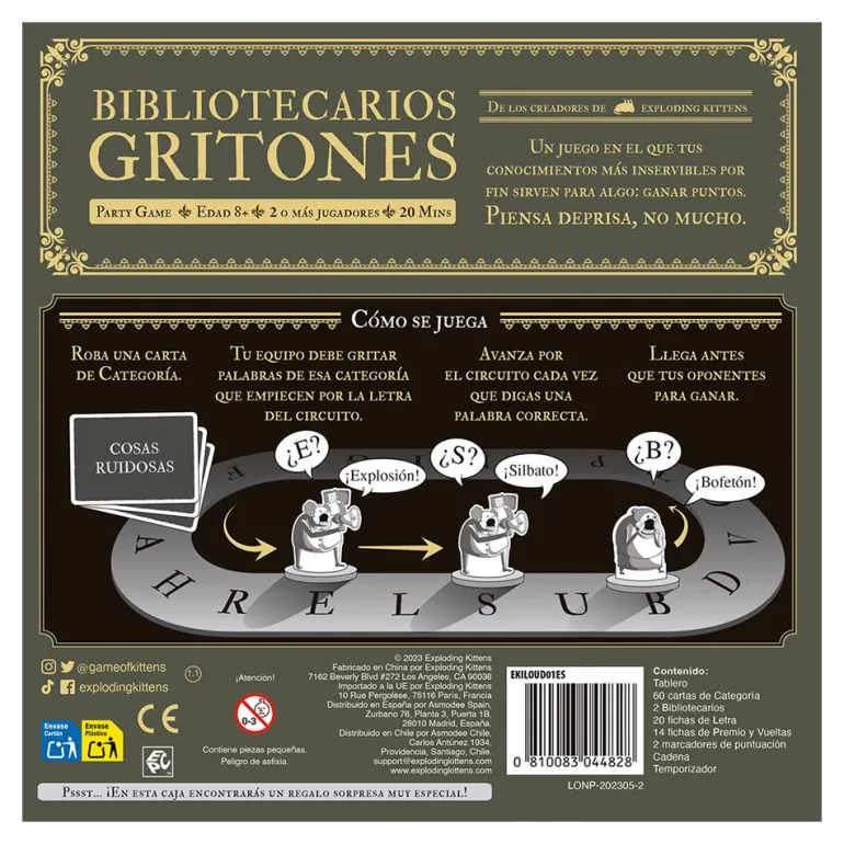 Nos encantan los juegos de mesa que unen diversión y aprendizaje, y este es un gran ejemplo. Niños y niñas desarrollarán su rapidez visual, su memoria y su vocabulario mientras piensan las palabras más acertadas para que su equipo gane. Los más rápidos en gritar las palabras correctas y completar su puntuación ganarán la ronda mientras alzan la voz en la única biblioteca en la que alzar la voz tiene premio. Fabricante/Representante: Asmodee Group 18 Rue Jacqueline Auriol, 78280-Guyancourt France Email: [email protected]