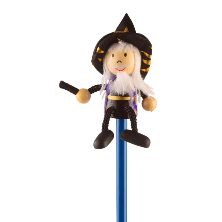 Lapicero de madera y tela pintado a mano con un brujo en la aprte superior. Los pies de madera hacen un sonido de chasquido al golpear contra el lápiz. ¡También se pueden usar como marionetas! ¿Quién podría imaginar que los lápices de tu escritorio tendrían formas tan divertidas?
