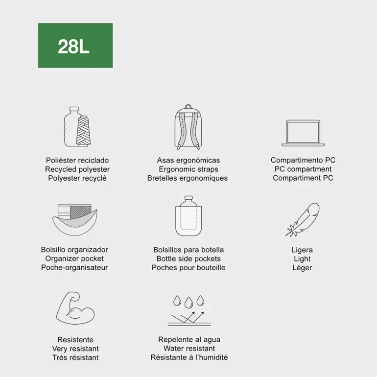 Descubre la genial mochila triple, hecha a partir de botellas de plástico recicladas, y sorprende a todos y todas con su diseño. ¡Perfecta para transportar tus libros cómodamente!