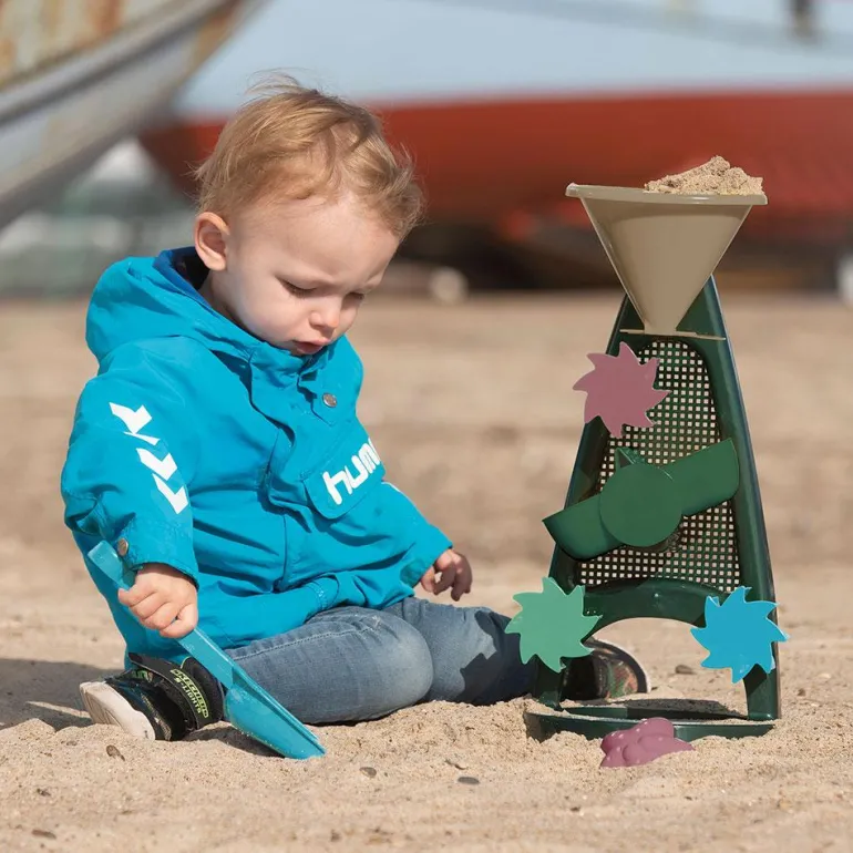 En el gran embudo que tiene en la parte superior se puede verter agua y observar cómo se ponen en movimiento las ruedas y el depósito oscilante, ¡será divertidísimo observar el recorrido que hace el agua! Incluye una pequeña pala y un molde para completar el set y favorecer la imaginación de los más pequeños.