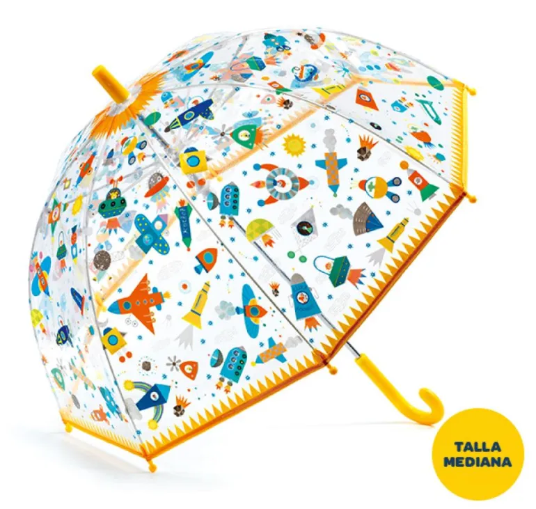 ¡Te damos la bienvenida al universo más alucinante! Alegra tus días de lluvia con este vistoso paraguas transparente, repleto de ilustraciones inspiradas en el espacio.