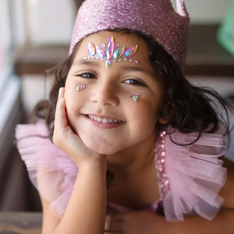 Este original set de adhesivos faciales realizadas con brillantina impresa y piedras preciosas simuladas, despertará la imaginación de niños y niñas, pues son ideales para completar su disfraz favorito, o para utilizarlos en cualquier momento y expresar su personalidad y gustos. Los disfraces son una gran herramienta para ejercitar la imaginación y las habilidades sociales de los niños y niñas, que les permiten interpretar diferentes roles, de modo que se animarán a idear sus propias historias e interpretarlas, lo que mejora su vocabulario y sus dotes creativas.
