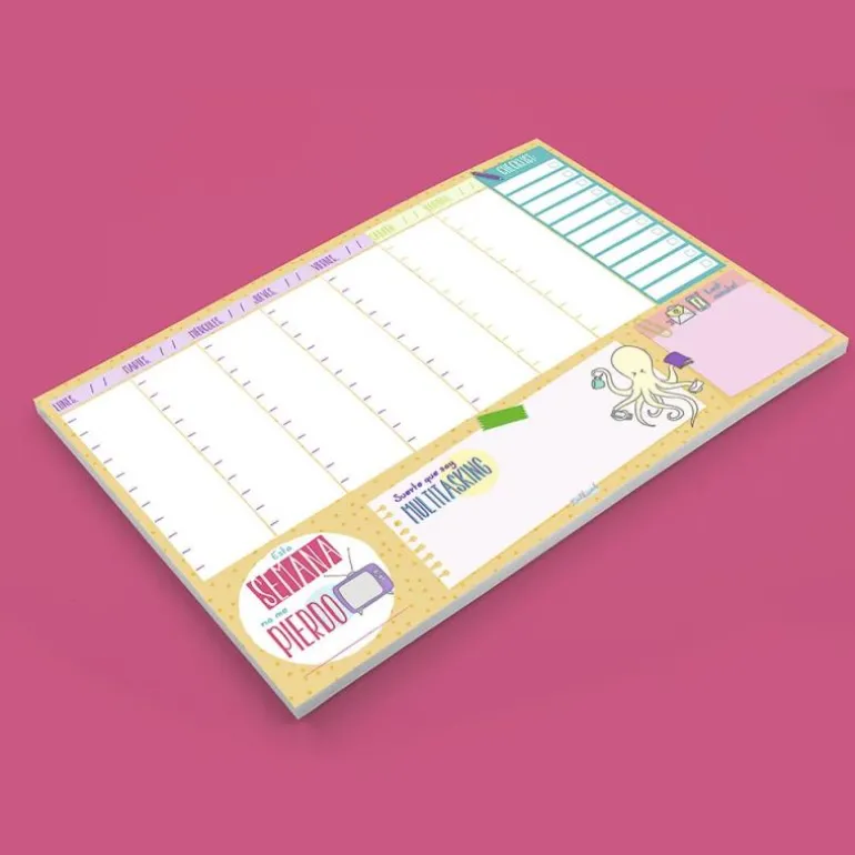 Planificador semanal, encolado en la parte inferior para arrancar las hojas fácilmente. En el interior dispone de cuatro diseños de página distintos. Papel de calidad de 90 gramos. En este planificador tendrás espacio diario para anotar tus menús, ejercicio y tiempo personal. También dispondrás de un espacio para el objetivo de la semana o para aquellos asuntos que no tienen un día asignado y de una checklist.