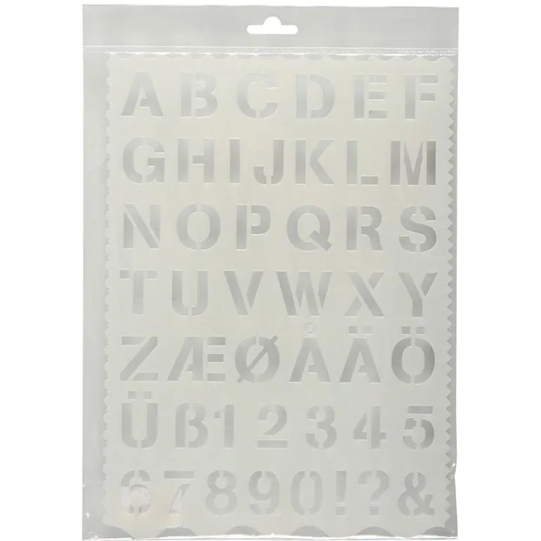 La plantilla está fabricada en plástico, e incluye letras, números y símbolos. Mide 21 x 29 centímetros.