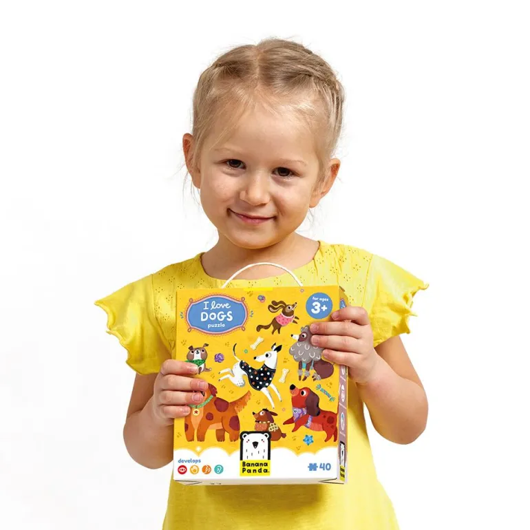 Este genial puzle es ideal para que niñas y niños descubran sus propias capacidades, mientras asocian y unen las piezas entre sí. Está ilustrado con la imagen de simpáticos perros y cachorros que llamará su atención y despertará su curiosidad. ¡Pasadlo en grande!