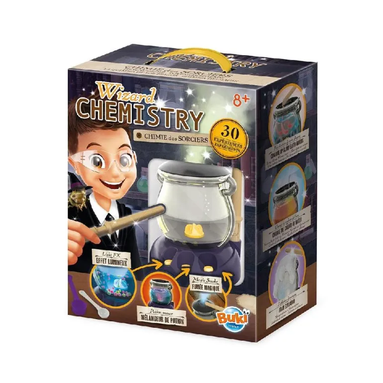 Este set contiene utensilios para realizar nada menos que 30 experimentos mágicos: varitas que hacen las veces de pipeta y cuchara, un caldero y algún que otro instrumento misterioso más te ayudarán a lograrlo. Los ingredientes que requiere cada actividad son productos que se encuentran habitualmente en una casa; sólo necesitarás reunirlos, ¡y ponerte manos a la obra!