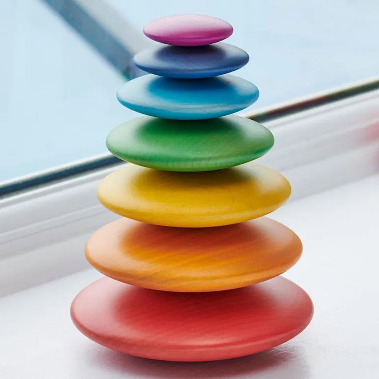 Preciosos y suaves óvalos gigantes de madera maciza de haya, de tamaños escalonados, con un tratamiento natural que mantiene y respeta la textura de la madera y sus vetas. Sus colores están inspirados en los siete colores del arco iris, para hacer creaciones de manera libre y dejar volar la imaginación de los más pequeños y pequeñas de la casa.