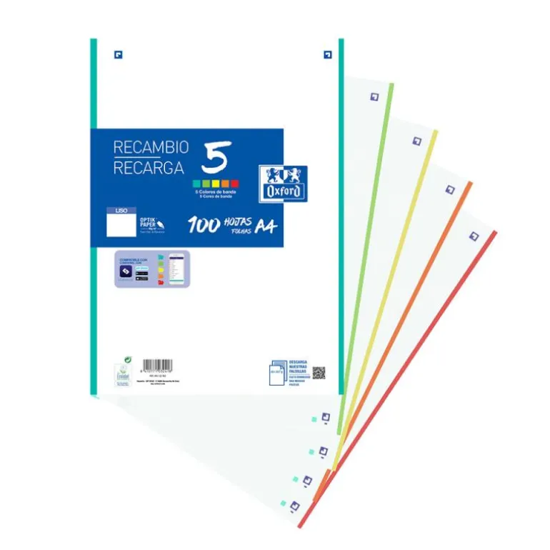 Incluye 100 hojas lisas A4 de 90gr. con 4 taladros y bordes en 5 colores.