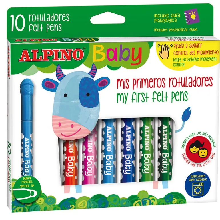 Disponen de punta gruesa y redondeada, por lo que no se deforma aunque se presione contra el papel, lo cual asegura que los rotuladores se mantendrán intactos. Incluye 10 rotuladores Alpino Baby. Recomendados a partir de 18 meses.