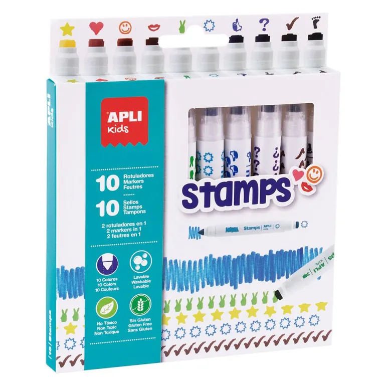 Cada rotulador es de un color y tiene un diseño distinto para estampar, ¿cuál es tu favorito? Diviértete coloreando todas tus creaciones, o completa tus escritos, apuntes o dibujos con las originales formas para estampar. Caja con 10 rotuladores de doble punta: punta redonda y stamp.