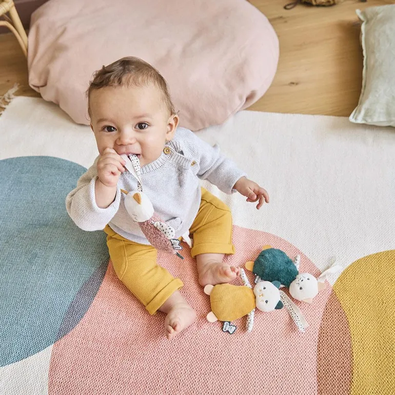Es uno de los primeros juegos para el bebé idóneo para estimular habilidades como la vista, gracias al contraste de colores que tiene entre su cuerpo y la carita del gatito, y además el tacto e incluso la exploración ya que, cada gatito, tiene diferentes texturas y pesos. También te permite jugar de manera individual con cada uno de ellos, e incluso agarrarlo a la cuna o el carrito para evitar que el bebé lo pierda cuando salgáis de paseo.