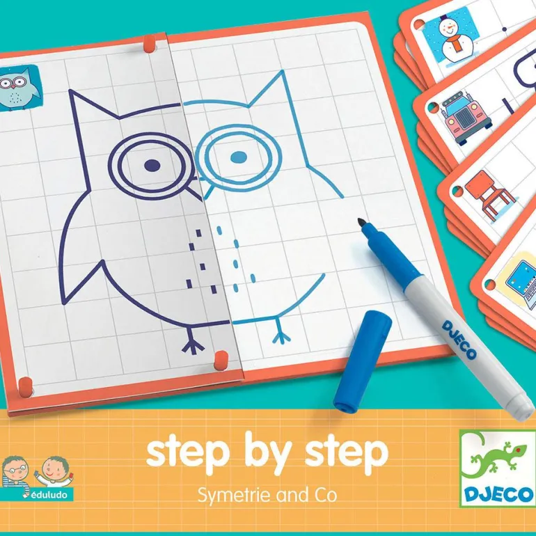 Con este juego, podrás practicar en la pizarra borrable cómo dibujar cada figura guiándote por la cuadrícula de la pizarra base, sujeta con los pivotes las tarjetas de mitad y completa el dibujo contando los cuadros como si fuera un espejo, ¡es muy fácil! Cuando hayas practicado suficiente, verás las imágenes completas, deja volar tu imaginación y podrás crear un sinfín de diseños