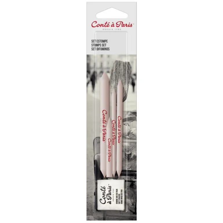 Blíster con cuatro difuminos de distintos grosores: 9,5 mm, 7,5 mm, 5 mm, y un difumino tortillón de 7 mm. También contiene una goma de miga de pan. Muy útiles para trabajar con carboncillo, grafito, pastel o sanguina.