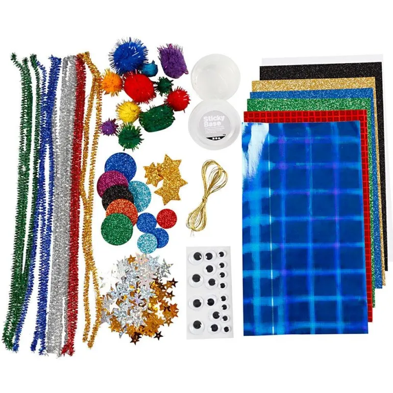 Contiene diversos materiales: Papel holográfico y de purpurina, ojos móviles, hilo dorado y pompones entre otros.