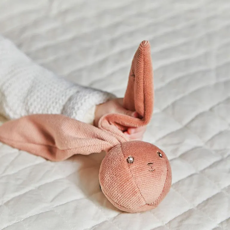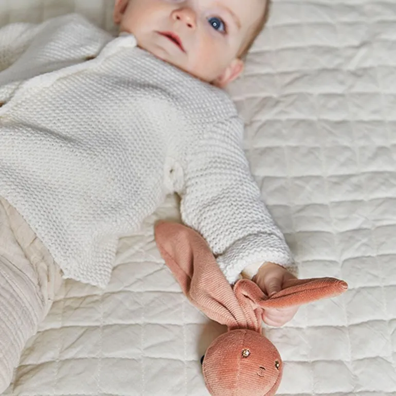 Este tierno sonajero en forma de conejo en color terracota es muy fácil de manipular por las pequeñas manos de tu bebé, que podrá agitarlo para escuchar el suave cascabel de su interior. Sus grandes orejas son perfectas para sujetar a este nuevo amigo a la silla de paseo, la cuna o incluso al bolso cambiador y que os acompañe a todas partes.