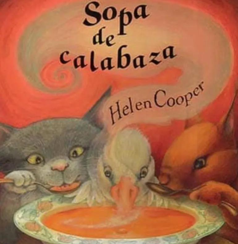 En medio de un bosque, en una bonita cabaña viven un Gato, una Ardilla y un Pato. Cada día hacen sopa de calabaza para cenar: el Gato trocea la calabaza, la Ardilla remueve la sopa y el Pato le pone la sal. Viven los tres muy felices, teniendo cada uno su tarea diaria. Pero un día el Pato decide cambiar los papeles, y se arma un gran lío entre los tres amigos. Este cuento nos enseña lo difícil que es cambiar la organización de una casa y los problemas que puede suponer, y lo que puede sufrir la gente que te quiere cuando te cree perdido. También muestra lo bonito que es el no reprocharse unos a otros por algo que ya ha pasado. Pero lo que prevalece en Sopa de Calabaza es la amistad entre los tres personajes. El tema de la convivencia y la amistad de los amigos, frente al rechazo del grupo, florece en este álbum ilustrado por la gran artista que es Helen Cooper. Su formación como profesora de música y ceramista se reflejan en la cadencia armónica y estética de este cuento dedicado a niños de 4 a 6 años. Otros libros con los mismos protagonistas son: Una pizca de pimenta y ¡Deliciosa!