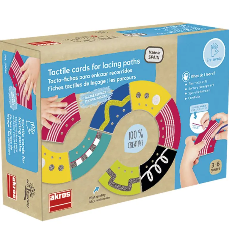 ¡Qué juego tan completo nos presentan nuestros amigos de Akros! Este juego para enlazar ofrece infinidad de posibilidades de juego con las que niños y niñas desarrollarán sus habilidades manuales y la motricidad fina. La superficie de las fichas dispone de diversos colores y formas y es rugosa, por lo que se pueden llevarse a cabo actividades de discriminación táctil, o de discriminación visual mediante el reconocimiento de formas y colores.