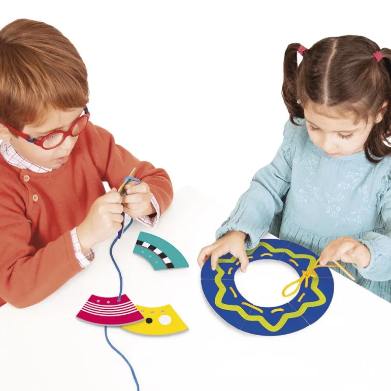 ¡Crea divertidos recorridos enlazando las fichas según colores y texturas! Solo tienes que unir las distintas piezas entre sí con el cordón para formar los caminos más locos.