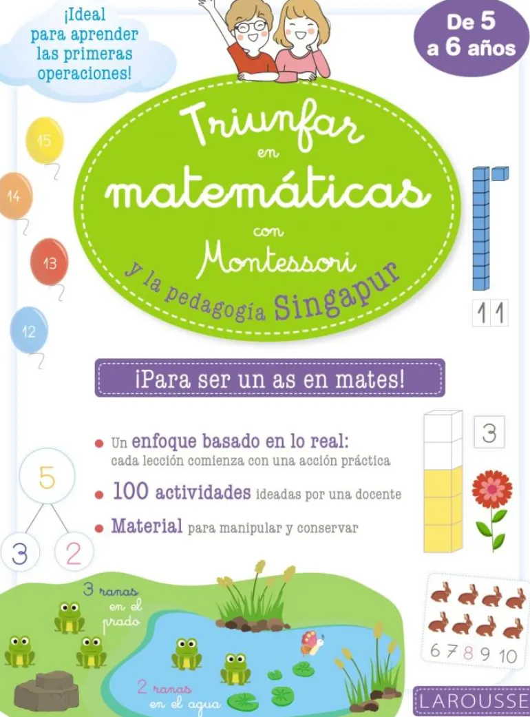 Este cuaderno propone más de 100 actividades variadas y progresivas, en consonancia con las pedagogías de Singapur y de Maria Montessori, para que los niños de 5-6 años descubran las matemáticas. A partir de un enfoque manipulativo y basado en imágenes, las actividades llevan al niño a representar de forma gráfica muy clara (esquemas y dibujos) los números y las situaciones matemáticas.A lo largo de este recorrido de iniciación a las matemáticas, el niño tendrá que:- Descubrir cada nuevo concepto mediante actividades de manipulación graduales, en las que deberá verbalizar su razonamiento: los números (hasta el 10, 20 y el 99), las longitudes, las formas, las masas, la suma y la resta. – Consolidar el aprendizaje por medio de actividades en las que puede aplicar de nuevo las estrategias descubiertas a lo largo de sus manipulaciones: representar esquemáticamente las cantidades y luego utilizar los símbolos matemáticos adaptados para pasar a la representación abstracta. – Utilizar material asociado a las actividades: reglas de cálculo, tarjetas de cifras, cubos, etc. le ayudarán a poner en práctica con facilidad las fases concretas y por imágenes del aprendizaje.