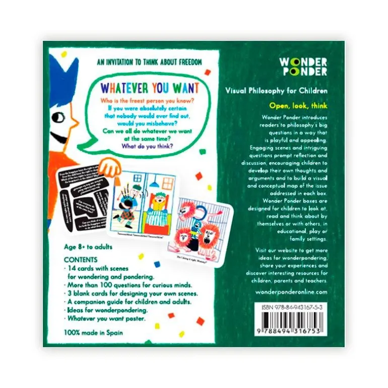 Who is the freest person you know? If you were certain that nobody was ever going to find out, would you misbehave? Can we all do whatever we want at the same time? What do you think? Whatever You Want is the third title in the Visual Philosophy for Children series by Wonder Ponder. Half-way between a book and a game, it comes in a box and invites readers aged eight and over (adults too!) to wonder and ponder about freedom in a playful and careful way. Wonder Ponder introduces readers to philosophy’s big questions in a way that is fun and appealing. Engaging scenes and intriguing questions prompt reflection and discussion encouraging children to develop their own thoughts and arguments and to build a visual and conceptual map of the issue addressed in each box. Wonder Ponder boxes are designed to look at, read and think about by themselves or with others, in educational, play or family settings.