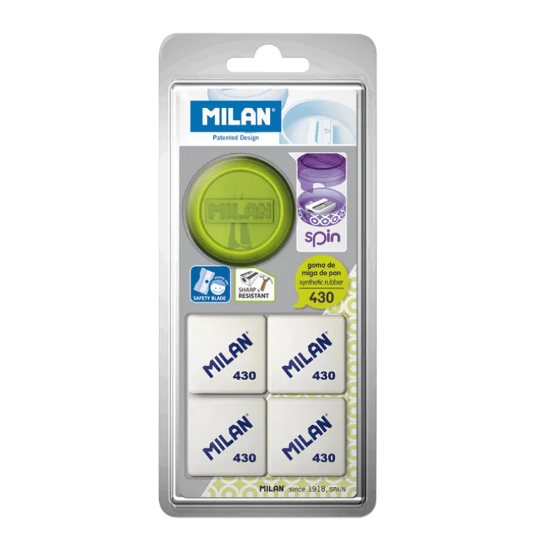 Sacapuntas de Milan, equipado con cuchilla de seguridad, que evita que se pueda separar la cuchilla del cuerpo del sacapuntas. Ideal para uso escolar.