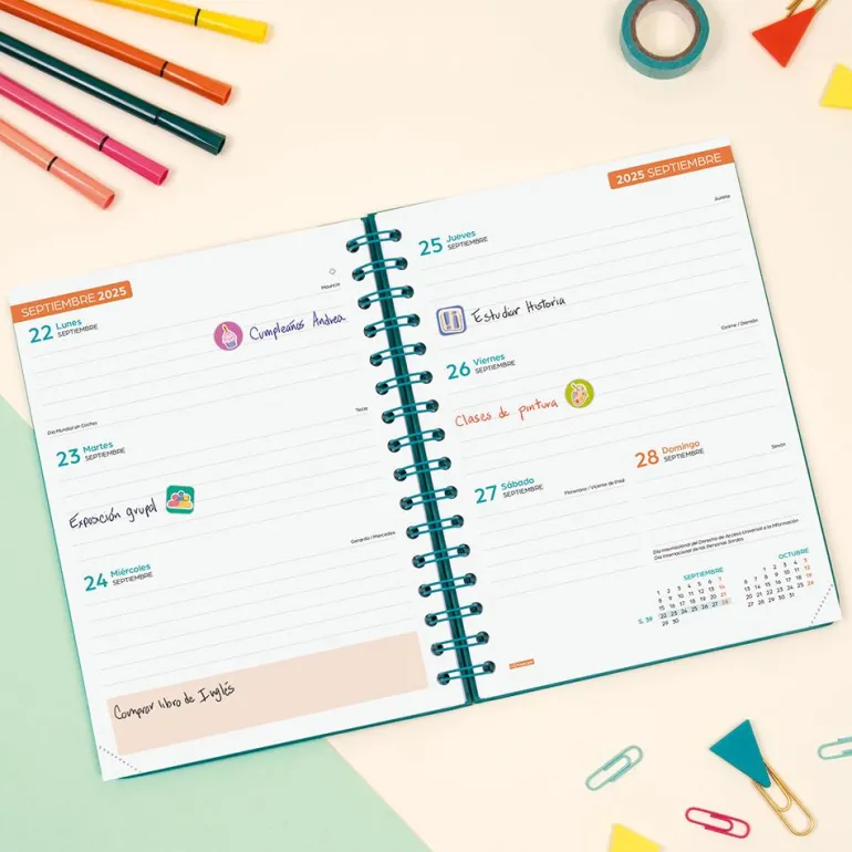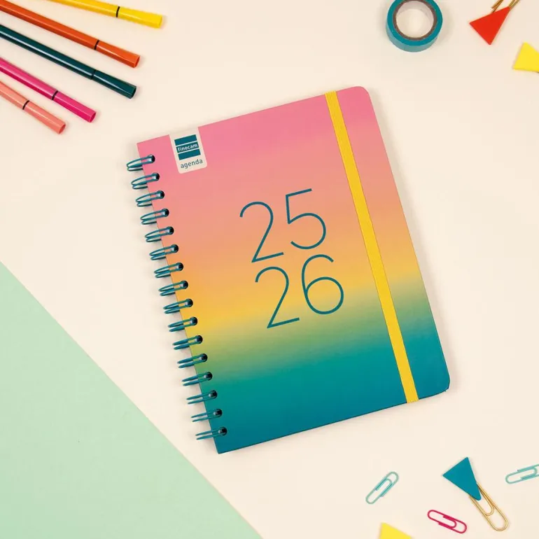 ¡Comienza el curso de la forma más divertida e inspiradora! Sorprende a todos con esta fantástica agenda tamaño cuarto, en formato semana vista y con un vistoso diseño degradado, ¡podrás tener bien organizadas todas tus tareas pendientes!