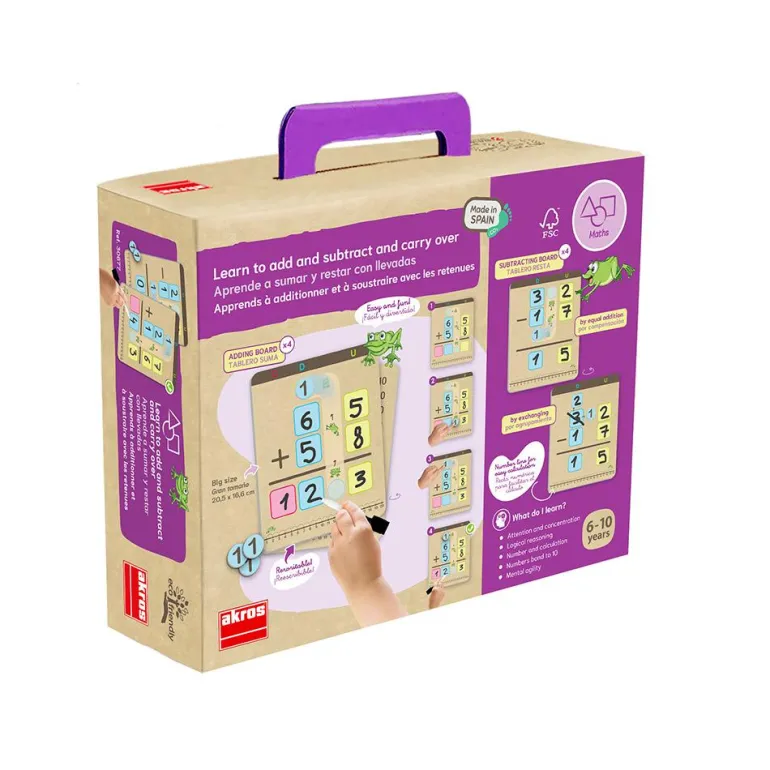 Nos encantan los juegos que se convierten en herramientas de aprendizaje de una forma divertida y sencilla y este juego es uno de ellos, se convertirá en un gran aliado para la enseñanza y la practica de las sumas y restas. Alguno de sus objetivos son: Aprender la suma y la resta con llevadas de manera visual y manipulativa. Trabajar la descomposición del número 10. Mejorar la agilidad mental y el cálculo rápido. Desarrollar la atención y la observación. Ayudar a generar bases para trabajar con el Método ABN.