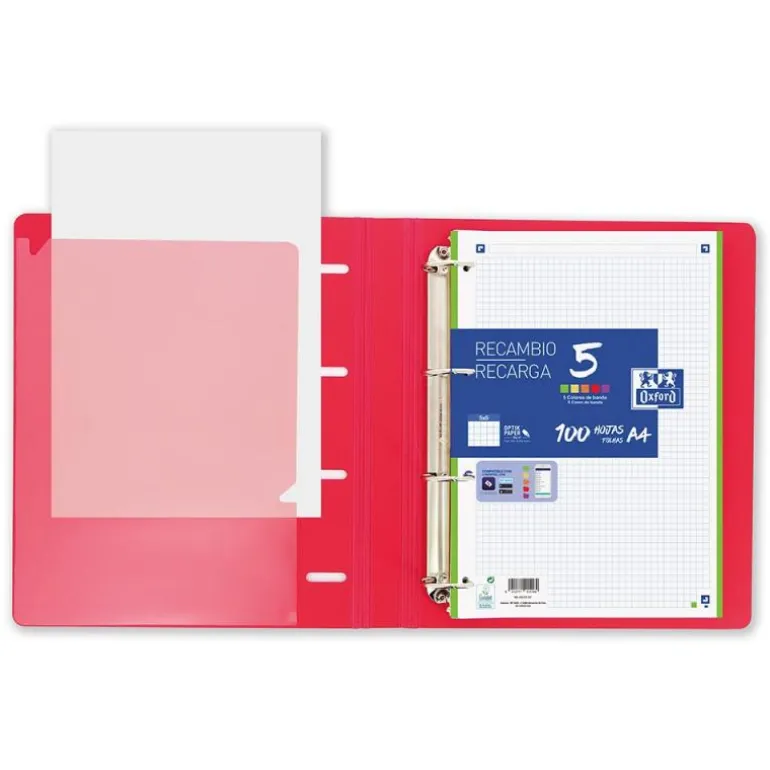 El recambio que incluye dispone de 100 hojas de 90g con cuadrícula de 5 milímetros, y con los laterales de colores para que puedas identificarlos con diferentes asignaturas o temas.
